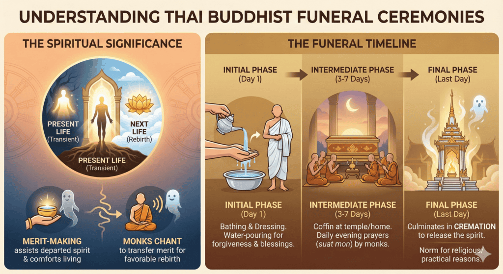 Thailand’s regional diversity influences funeral practices throughout the country. While Buddhist traditions form the foundation, local customs add distinctive elements.